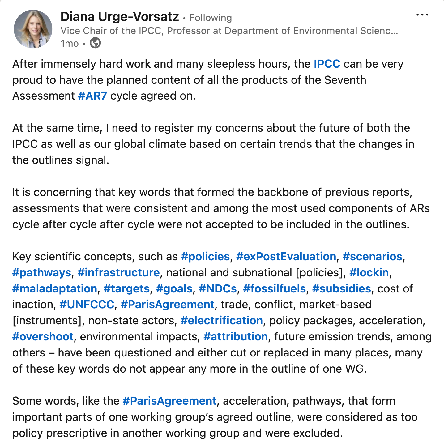 Těm z nás, kteří Ürge-Vorsatz sledujeme na LinkedInu, se vybavilo její varování před excesivním politickým ovlivňováním vědecké práce, které publikovala před pár týdny po kole jednání v IPCC: