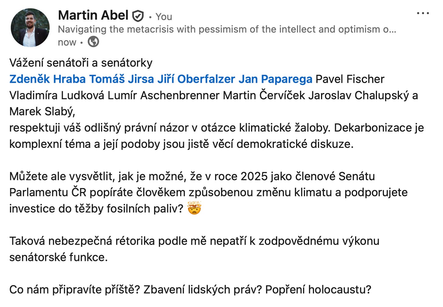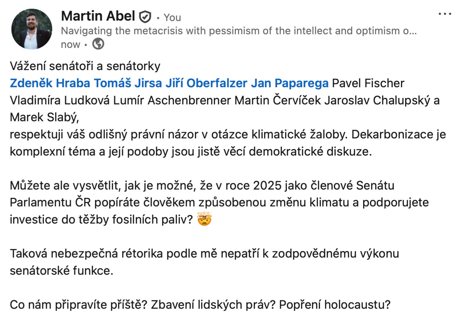 Nad tím už nestačí jen kroutit hlavou, nazvat to hloupostí nebo arogancí. To už je příliš dlouho příliš málo. Je potřeba nazvat to tím, čím to je: útokem. Útokem nejen na naši kolektivní schopnost dělat racionální soudy o světě a zodpovědně reagovat, ale především útokem na nás, kteří chceme žít v bezpečném klimatu, které provázelo celý vývoj lidské civilizace, a být ušetřeni způsobení jeho rozvratu ještě v tomto století. Protože útok to je, a to kdykoli, kdy popírání přichází z pozice moci, vlivu nebo odpovědnosti - ať už z nevědomosti, nebo záměrně. A je normální na to konto cítit bolest nebo hněv. Je normální označit popírání změny klimatu veřejně za útok na nás a pokud přichází od politika, vyzvat ho k vysvětlení, nebo rezignaci.