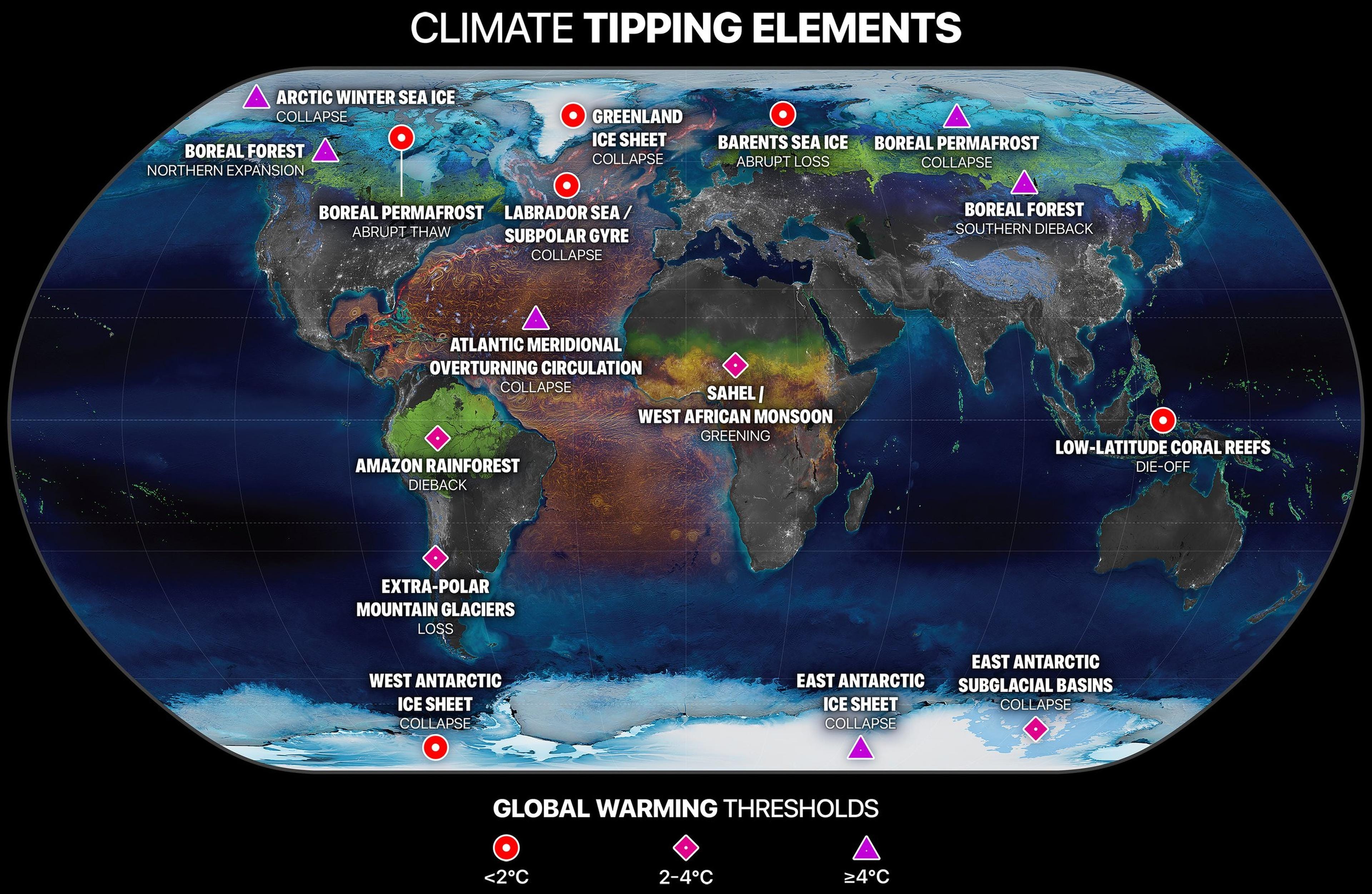 To jsou východiska, se kterými vědkyně a vědci na všech sedmi světadílech studují a modelují budoucnost klíčových ekosystémů pro světové klima (tipping elements): grónského ledového příkrovu, boreálního permafrostu, amazonských pralesů, atlantického proudění (AMOC) ad. Mezi klíčové vlastnosti klimatických bodů zlomu, které vědecká literatura3 opakovaně popisuje, patří, že jsou: